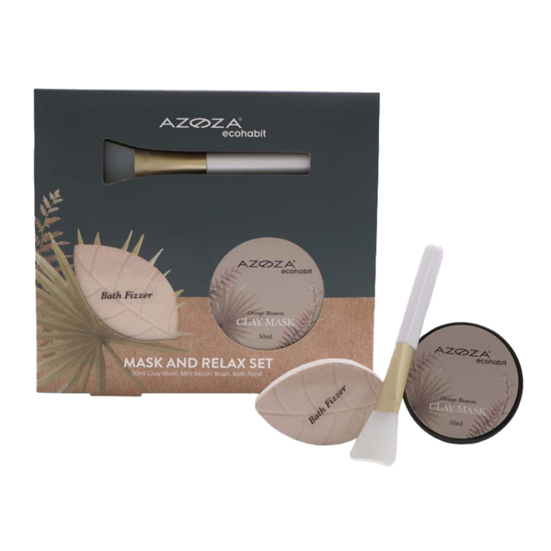 Setul cadou " Mask and Realx: contine: cutie de carton, masca pentru fata 50 ml, pensula pentru aplicat masca si o bomba de baie in forma de frunza.